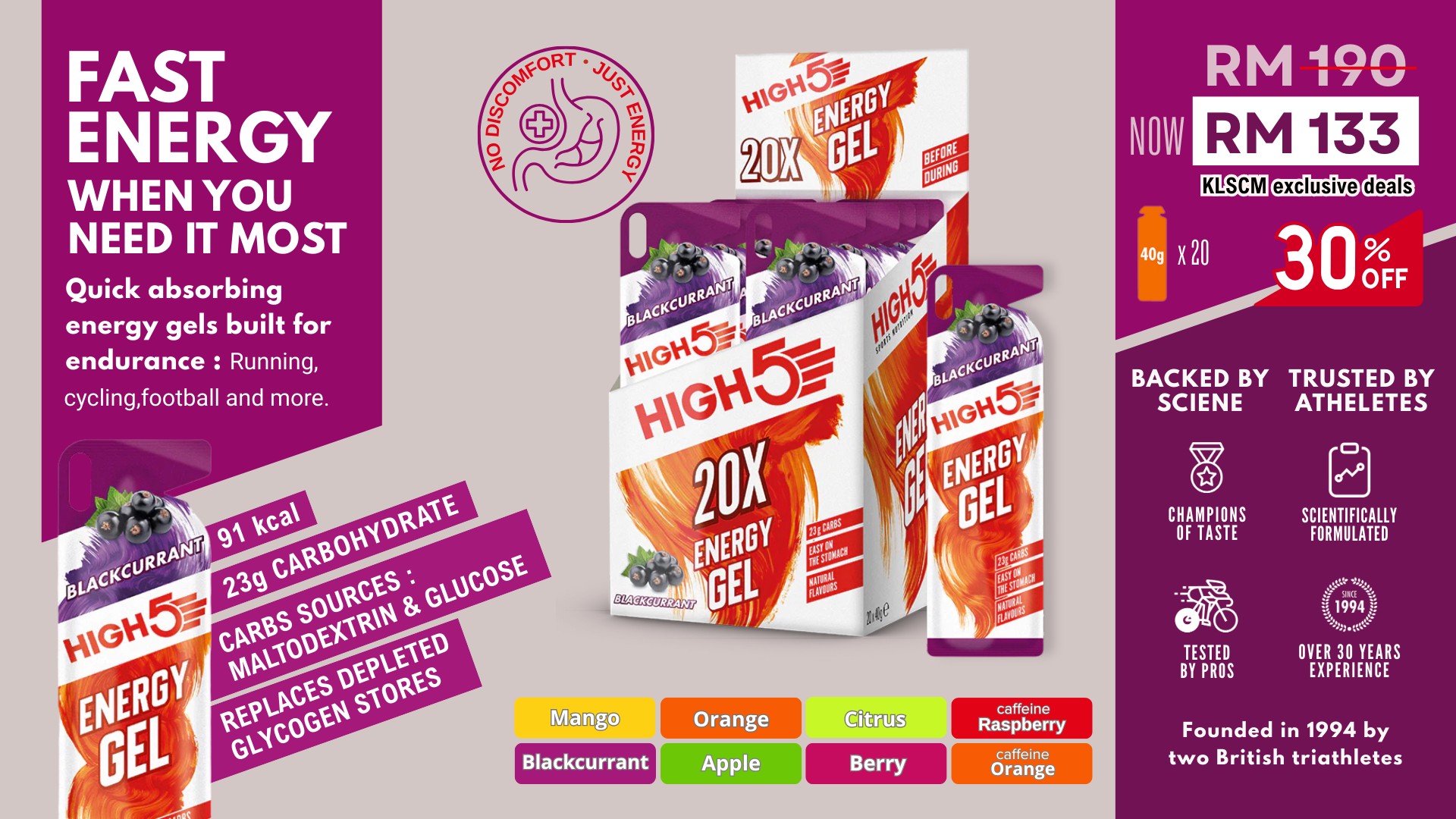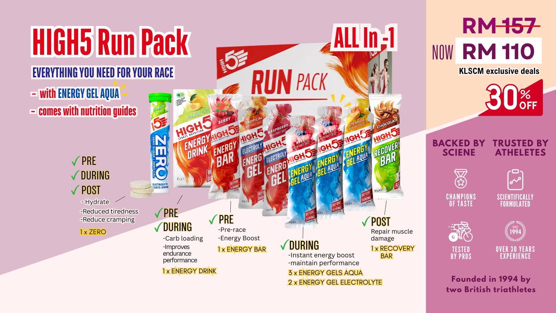 • The HIGH5 Run Pack is a selection of runners’ favourite products. Whether you are new to sports nutrition or training for your next running event (such as a 10km, half marathon, marathon, trail run or ultra), this pack is full of all your nutrition essentials. You will have everything you need for your KLSCM run to help sustain your performance, stay hydrated and recovery