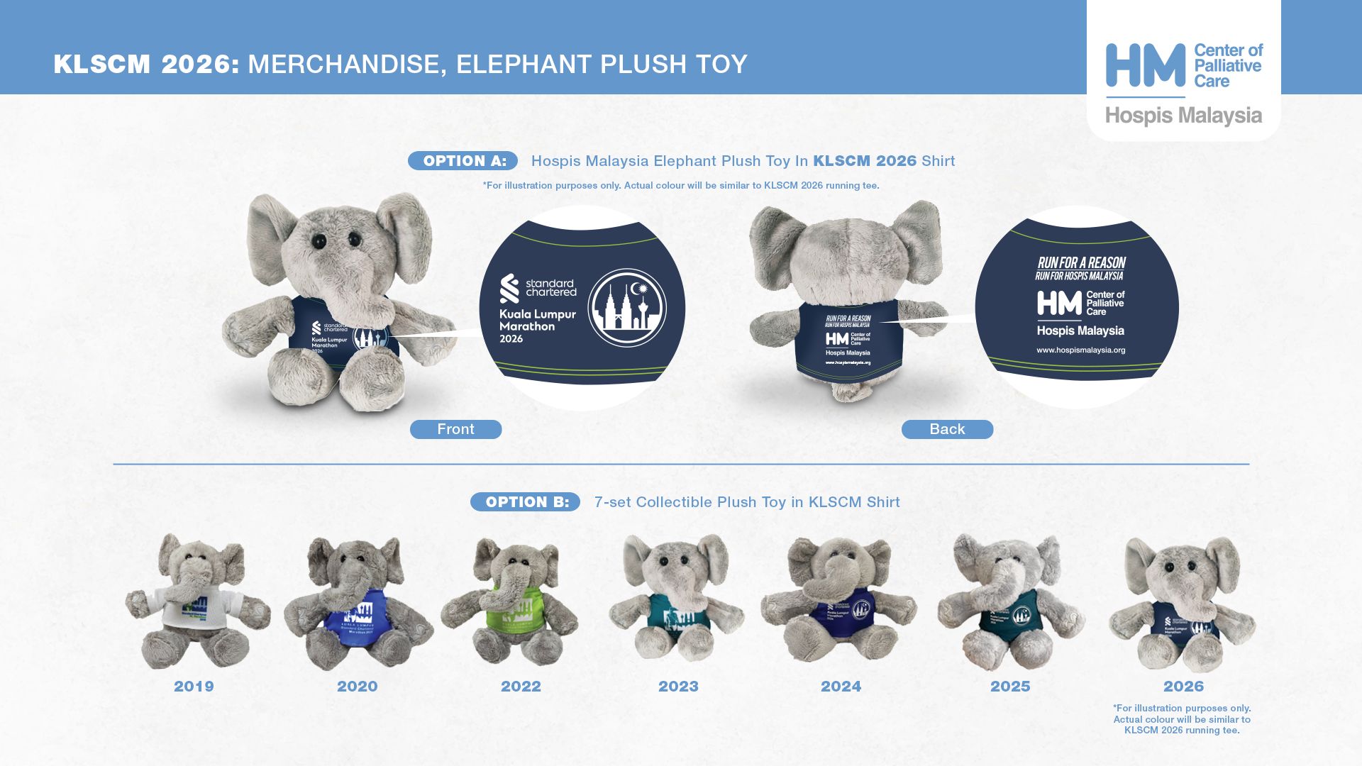 - Set of 7 Collectible Plush Toys: Each toy features a KLSCM logo from a specific year (2019, 2020, and 2022–2026) on the front of the shirt, and Hospis Malaysia logo on the back.