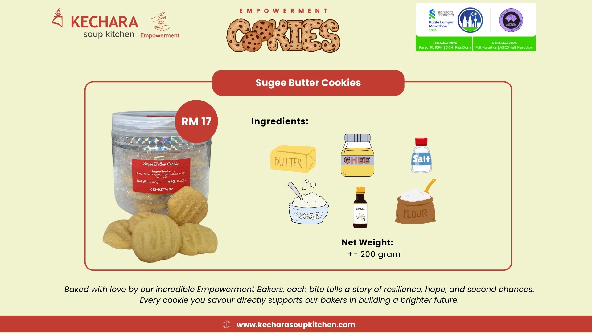 • A timeless heritage recipe elevated through thoughtful preparation and premium ingredients, our Sugee Butter Cookies celebrate traditional baking at its finest. Made with fine semolina and pure butter, these cookies offer a delicate, melt-in-the-mouth texture that is both light and satisfying. Their gentle richness and soft crumb create an elegant flavour profile that resonates with nostalgia and warmth. Carefully baked to maintain consistency and quality, they are ideal for festive celebrations and refined gift assortments. Subtle yet memorable, these cookies showcase the beauty of simplicity executed with precision and care.